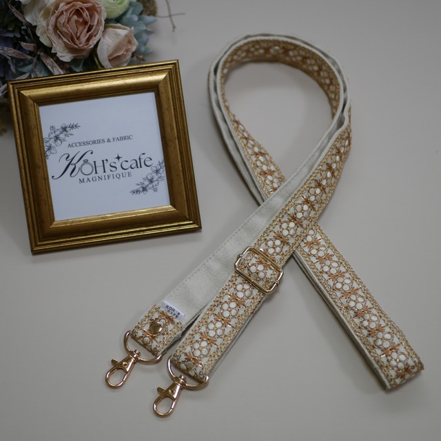 インド刺繍リボンのショルダーストラップ サイズ:約70~140cm(サイズ調節可能) 幅:約2.5cm 素材:インド刺繍リボン、帆布、真鍮製金具 スマホ・バッグ・カメラ等のストラップとしてお使いいただけます。取り外して付け替えが可能なので、一本持っておくと様々なシーンでお使いいただけるとても便利なアイテムです。 裏地は帆布生地を使用しております。帆布生地は丈夫でしなやかなので、肩への負担も軽減してくれます。 サイズ調節が出来るので、長くすれば、ショルダーバッグ、短くすれば肩がけバッグにもなります。 【注意事項】 ・海外製のリボンを使用しております。ほつれがあったり、リボンの幅が均一ではない場合があります。 ・すべて手作業で制作しております。確認不足でほつれなどがある可能性があります。お手数おかけしますが見つけた際はカットしていただけますと幸いです。 ・長くご使用いただくと、時間や摩擦によりリボンがすれて劣化していくことがあります。 ・帆布製で強度はありますが、重すぎるバッグには安全上ご使用いただけません。 【発送について】 ・製作・梱包・発送をすべて一人で行っています。当店の商品はご注文をいただいてから製作致しております。混雑具合によりますが発送までに最短3-14日前後お時間をいただいております。土日祝は発送業務は行っておりません。予めご了承下さい。 ※お急ぎの方はご購入前にご相談下さい。 ・輸送中の破損・不着に関しては責任を負いかねます。ご心配な方は宅配便をご選択下さい。お急ぎの場合も宅配便の方がより早くお届けできます。ご指定の期限内にお届け出来なかった場合、返金・返品は出来ませんので、お早めのご購入をよろしくお願い致します。 ・送料には梱包費、郵便局・宅配便センターまでの交通費なども含まれますので実際の送料より少しお高めに設定しております。予めご了承下さい。