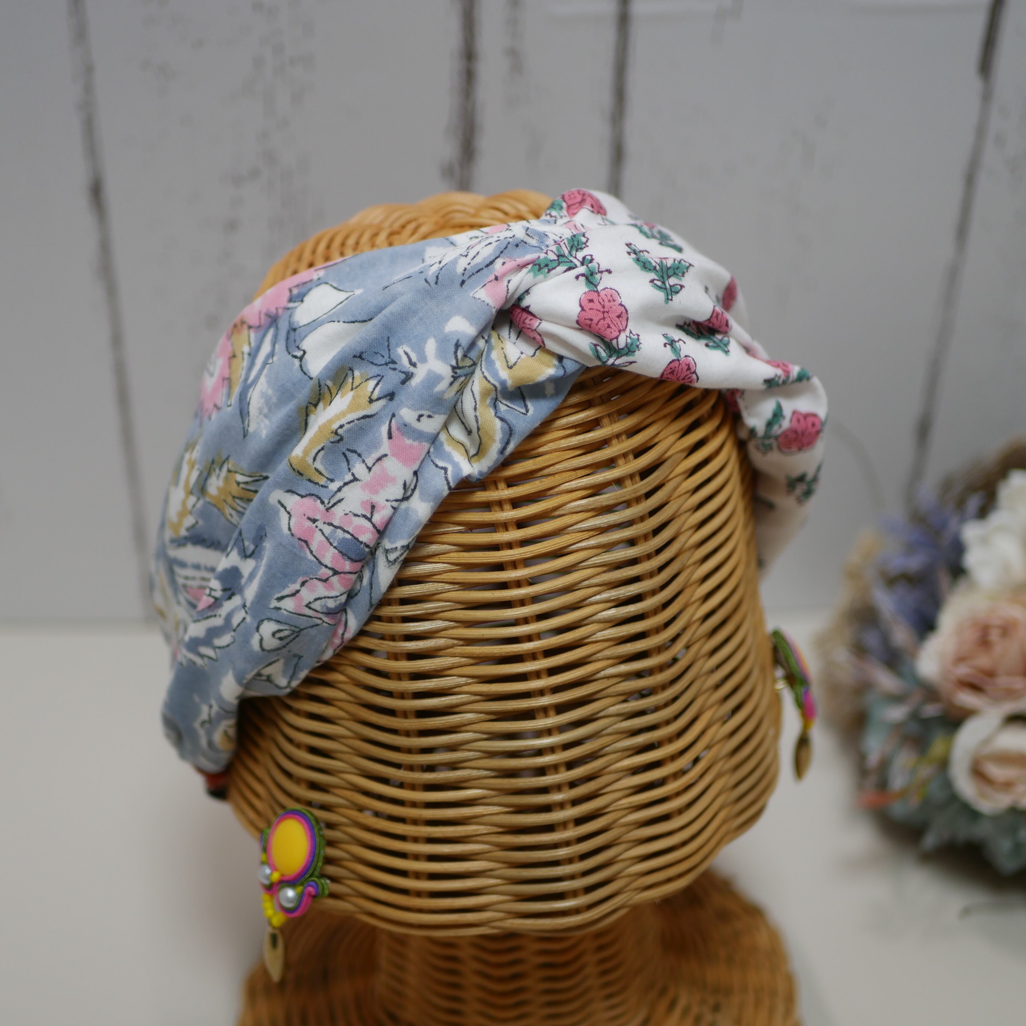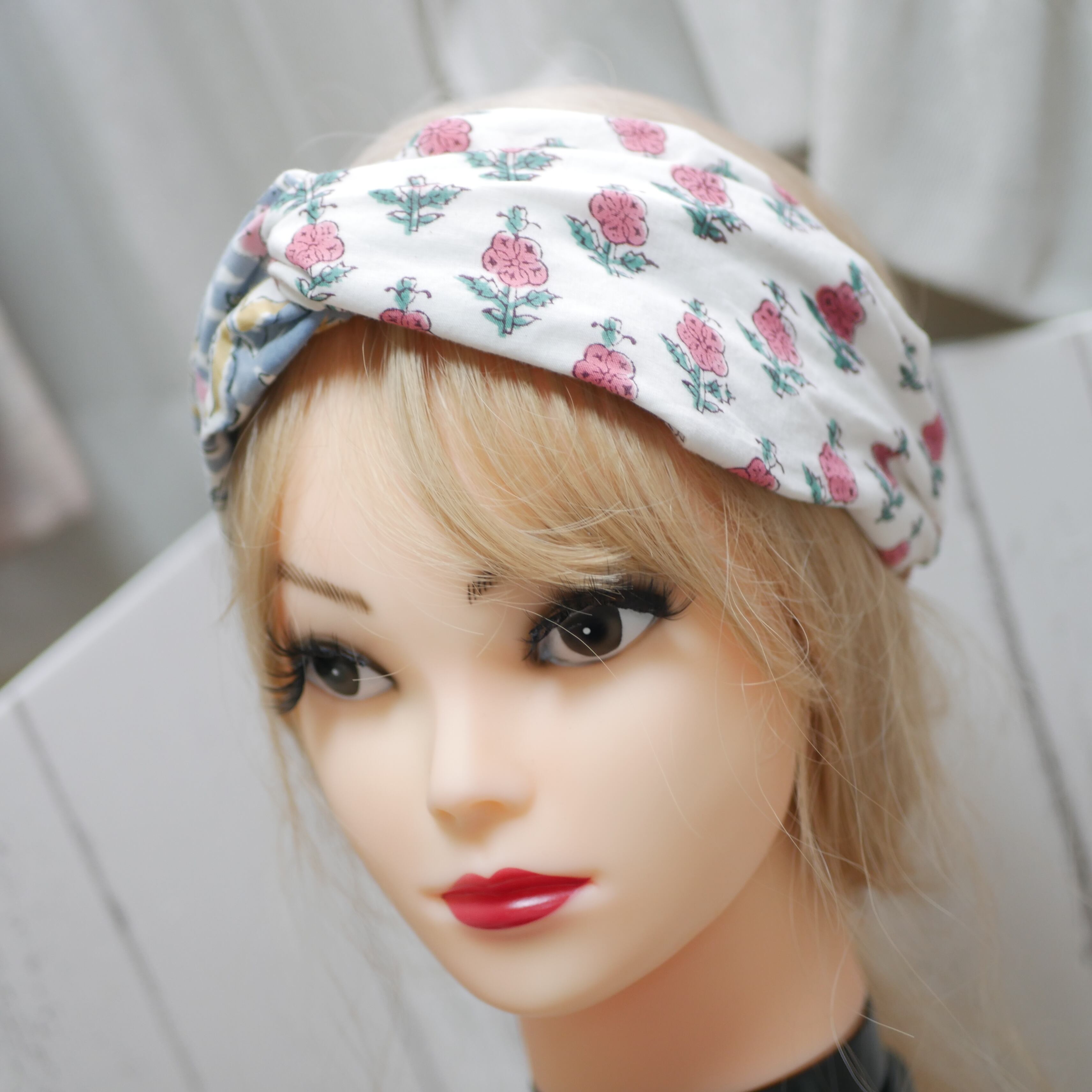 ターバンの生地はコットン100%のインドのブロックプリント生地を使用しています。ブロックプリント生地とダブルガーゼ重ねて縫っているので柔らかく、頭や髪に優しくフィットし、快適な使用感を実現しました。心地よいタッチと柔らかな素材感で、長時間の着用も快適です。
