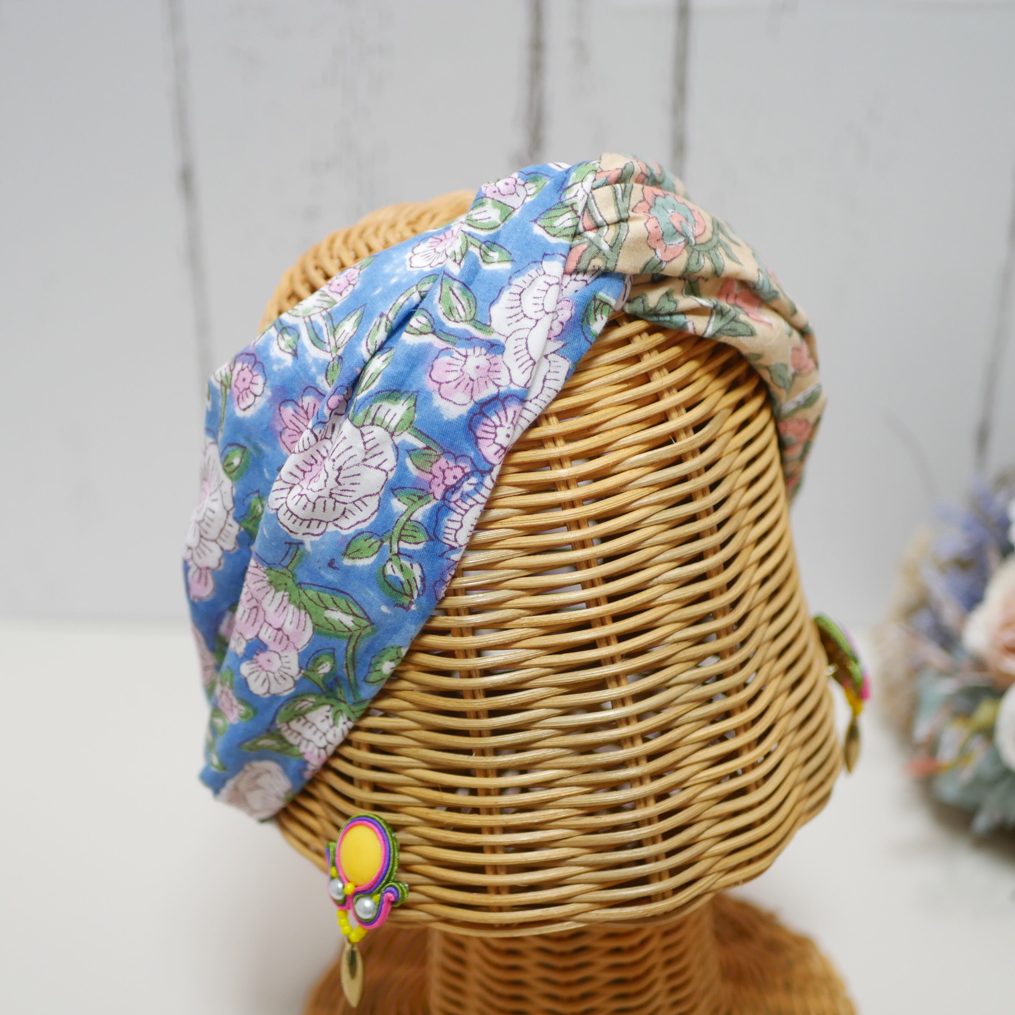 ターバンの生地はコットン100%のインドのブロックプリント生地を使用しています。ブロックプリント生地とダブルガーゼ重ねて縫っているので柔らかく、頭や髪に優しくフィットし、快適な使用感を実現しました。心地よいタッチと柔らかな素材感で、長時間の着用も快適です。