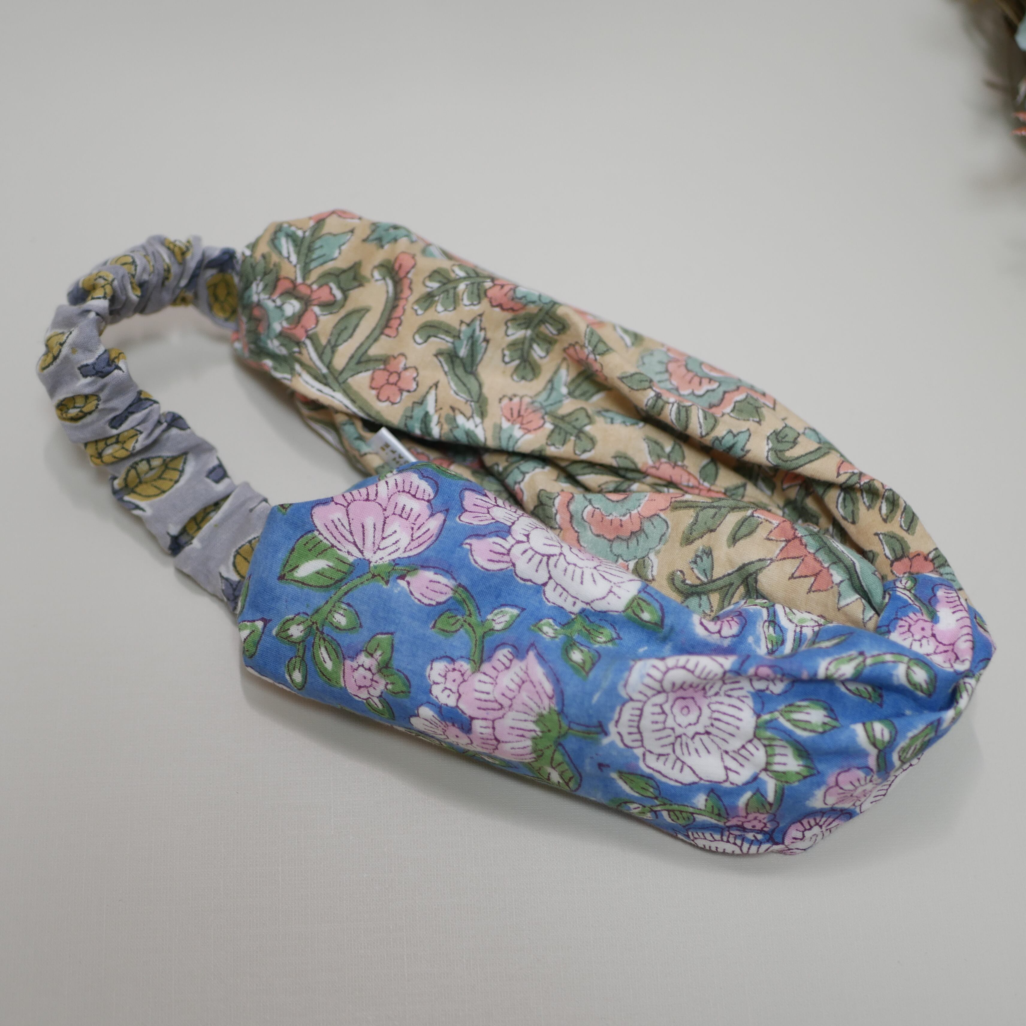 ブロックプリントとは、インドの職人さんが木版というスタンプを生地に押して柄を出しています。一つ一つ手作業で柔らかい風合いの生地です。その生地を違う2種の生地でクロスさせ、後ろのゴム部分も違うデザインで、計3種類を組み合わせた他とは一味違う個性的なデザインです。