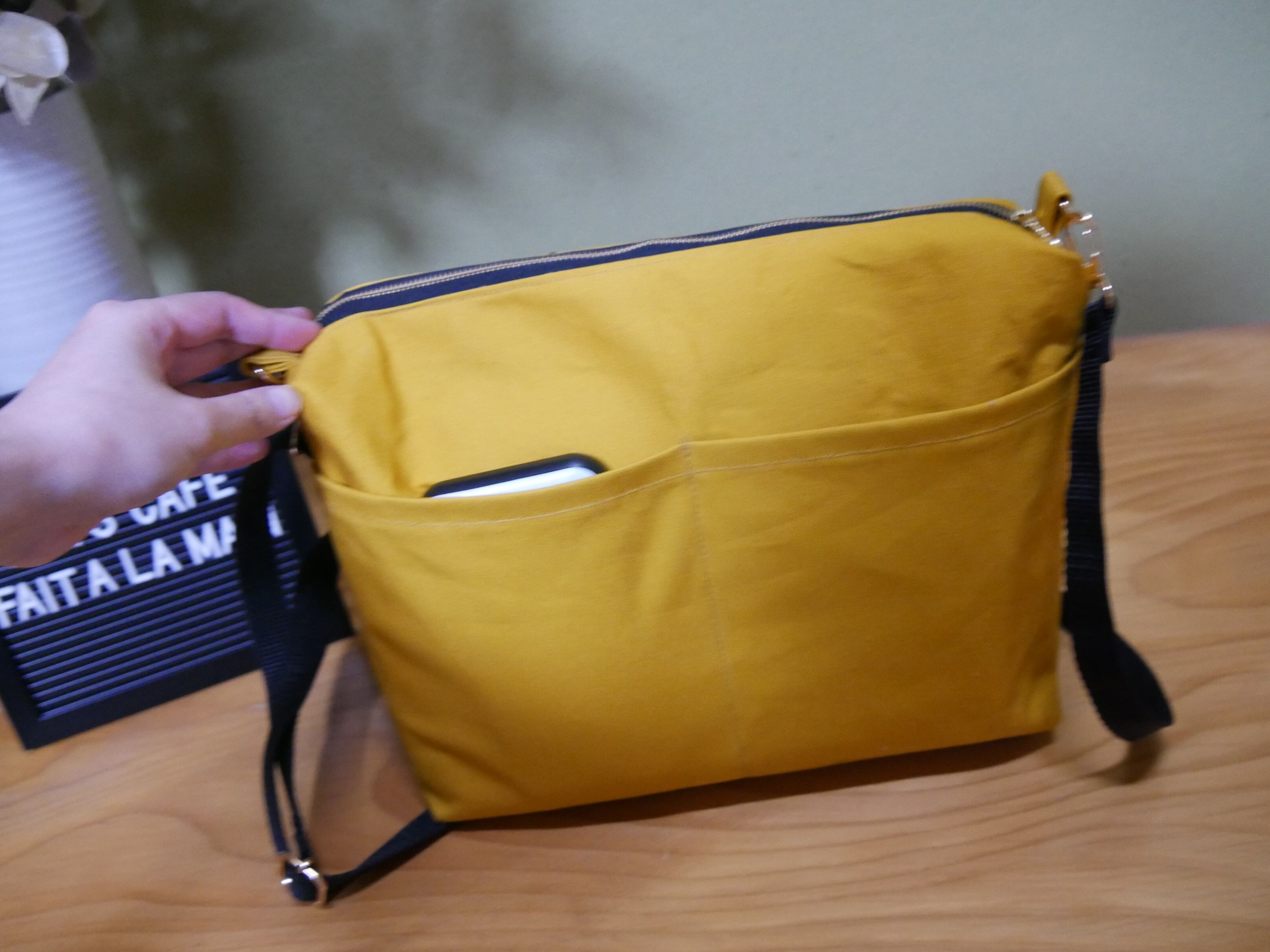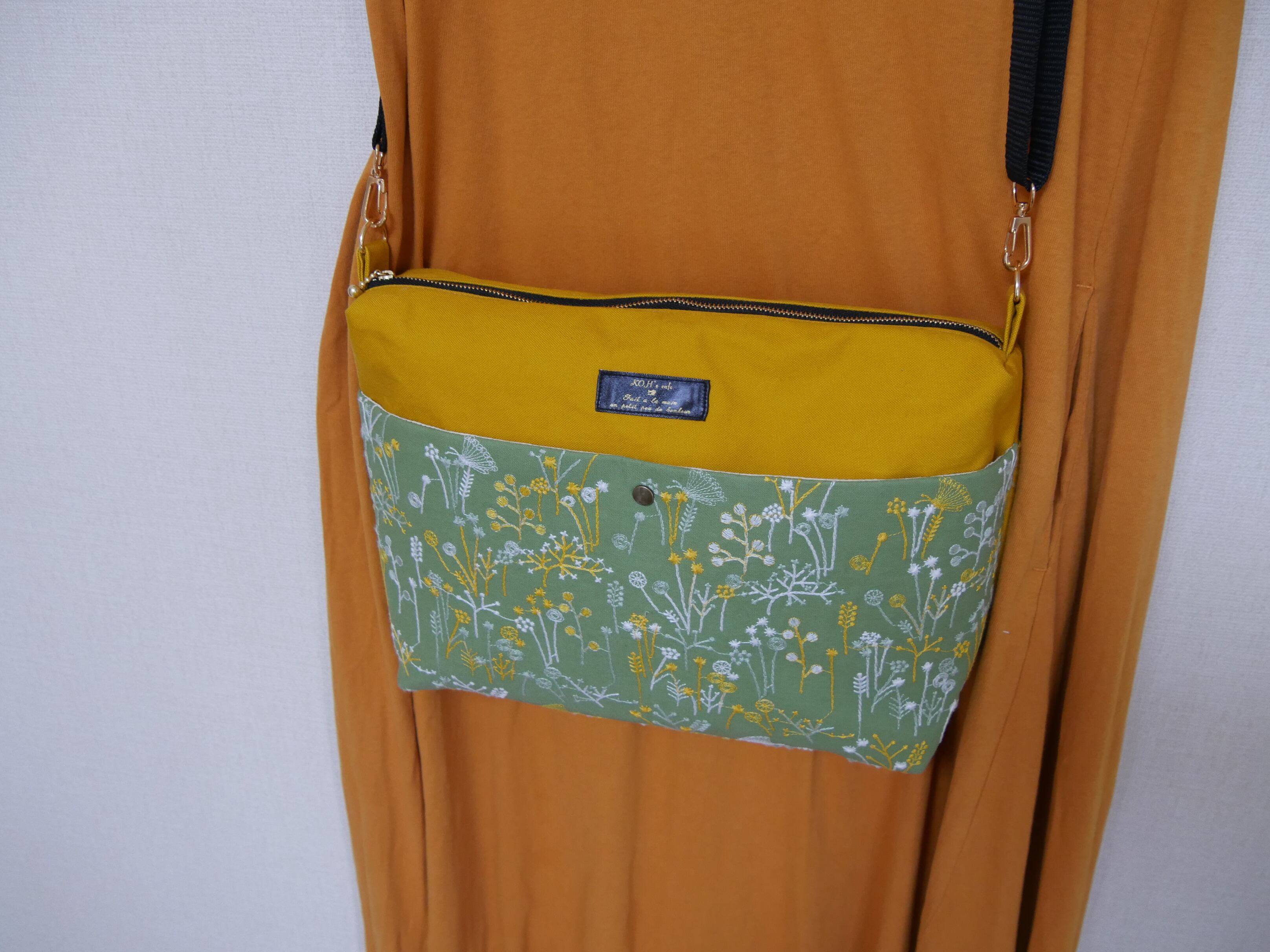 淡いグリーンの柔らかい風合いの刺繍生地とマスタードカラーの帆布を組み合わせたデザインです。