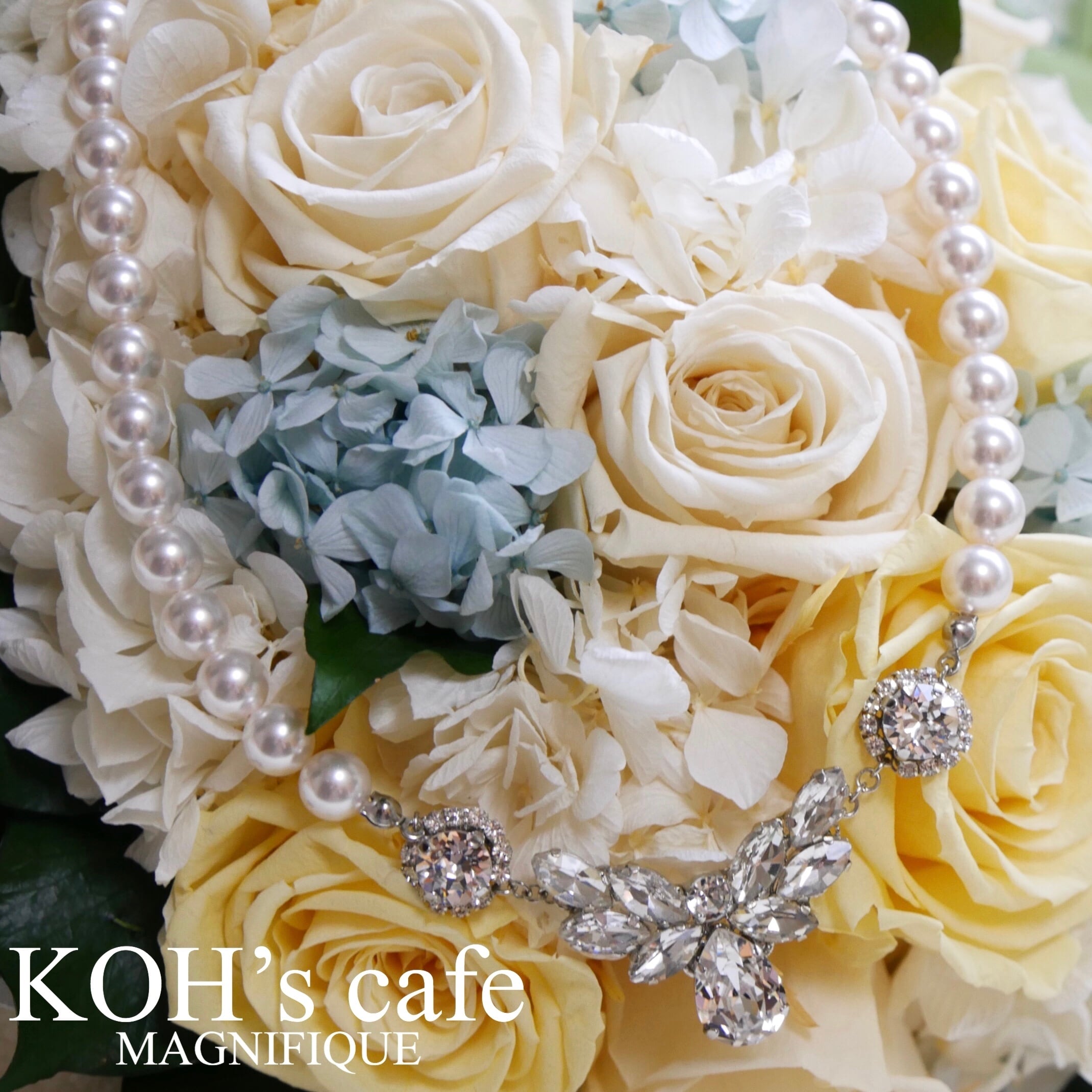 スワロフスキーの輝きと本物のパールと同じ輝きのあるクリスタルパールでお作りしているので、スポットライトが当たったときに花嫁様をより美しく、キラキラ輝かせてくれるアイテムです。
