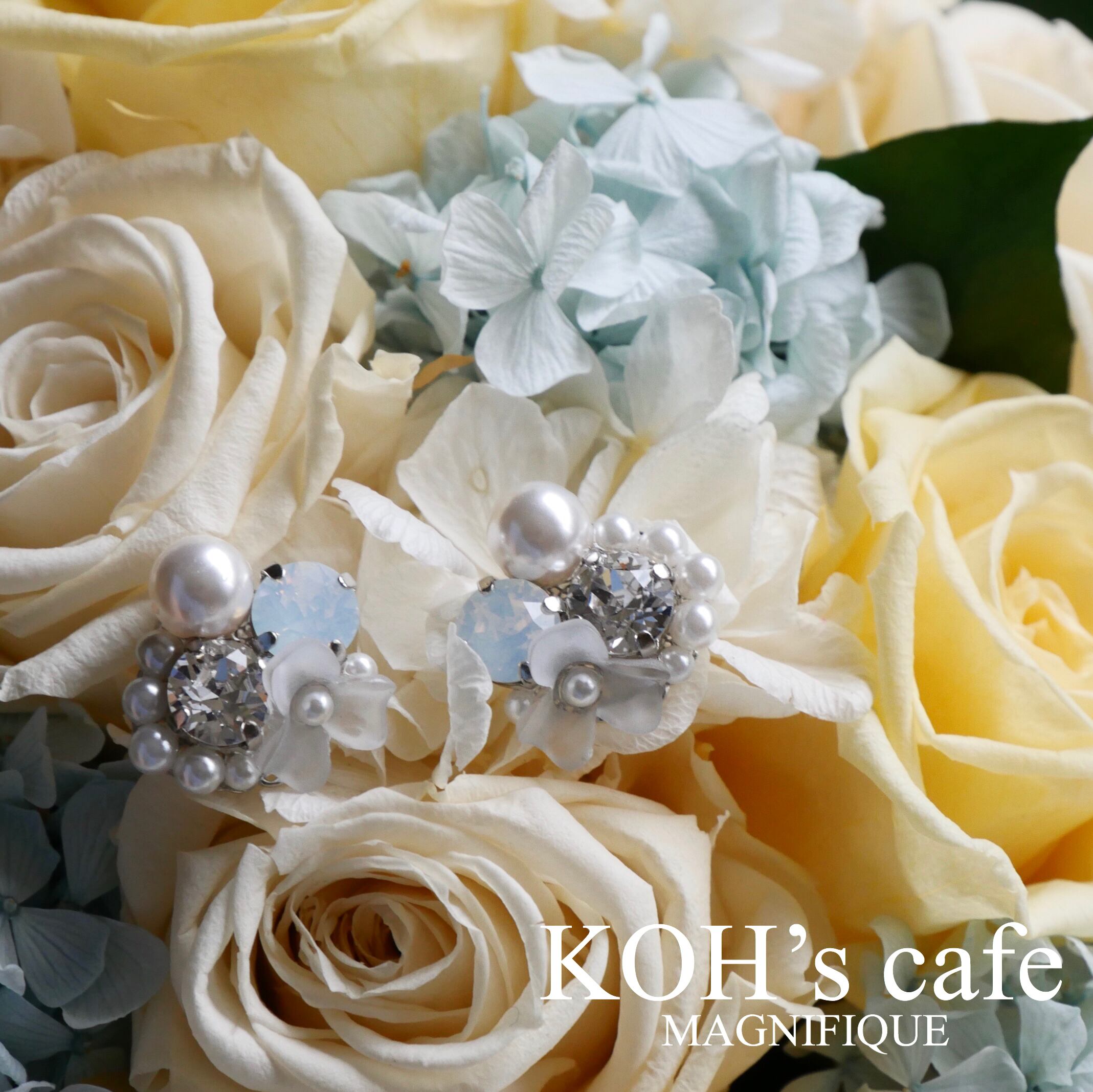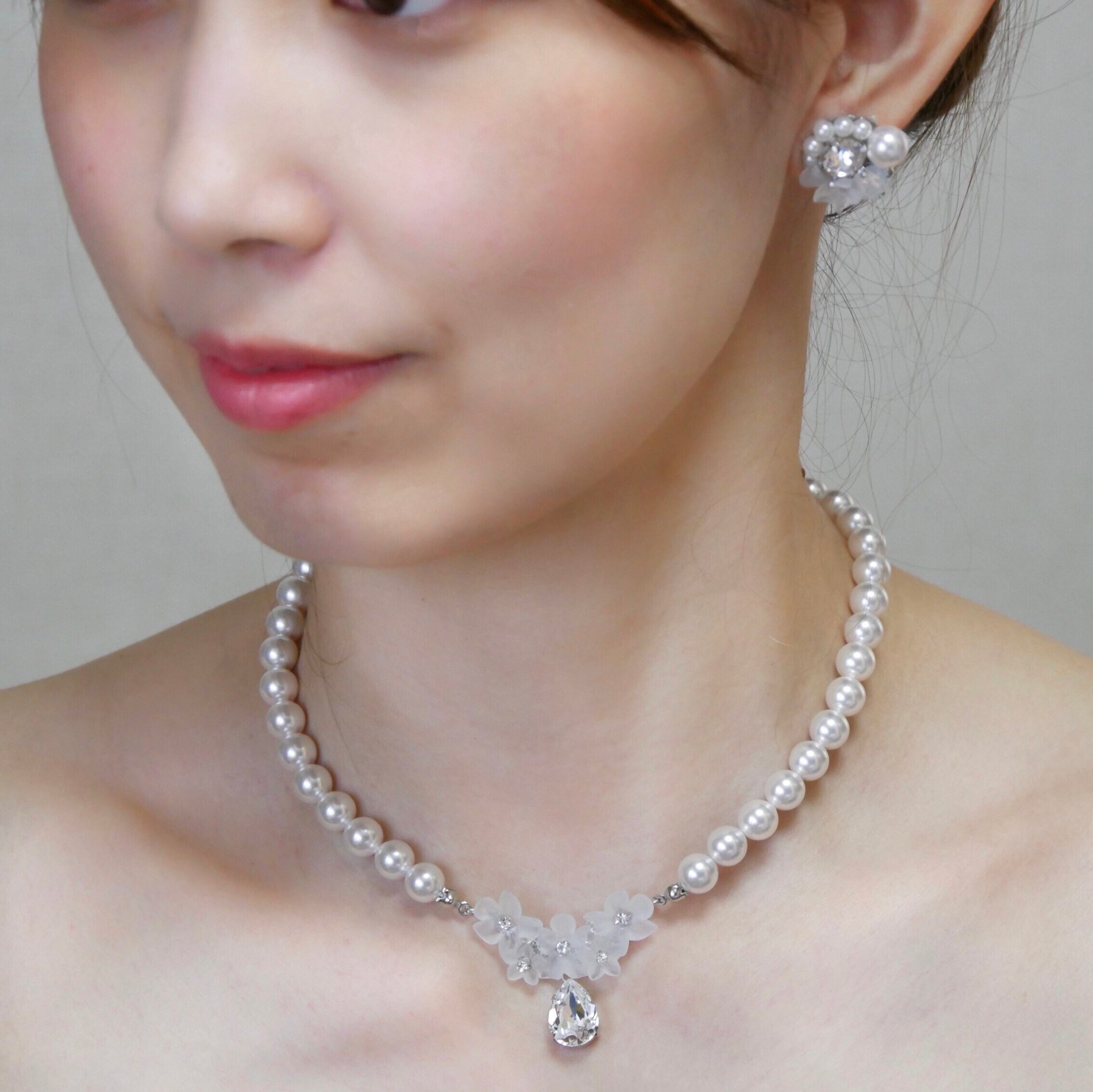 強い輝きを放つスワロフスキーとクリスタルパールを使用。贅沢な逸品。そこに柔らかな質感のドイツ製アクリルのお花のパーツを加えることで、高級感と可愛らしさを持ち合わせたイヤーアクセサリーです。