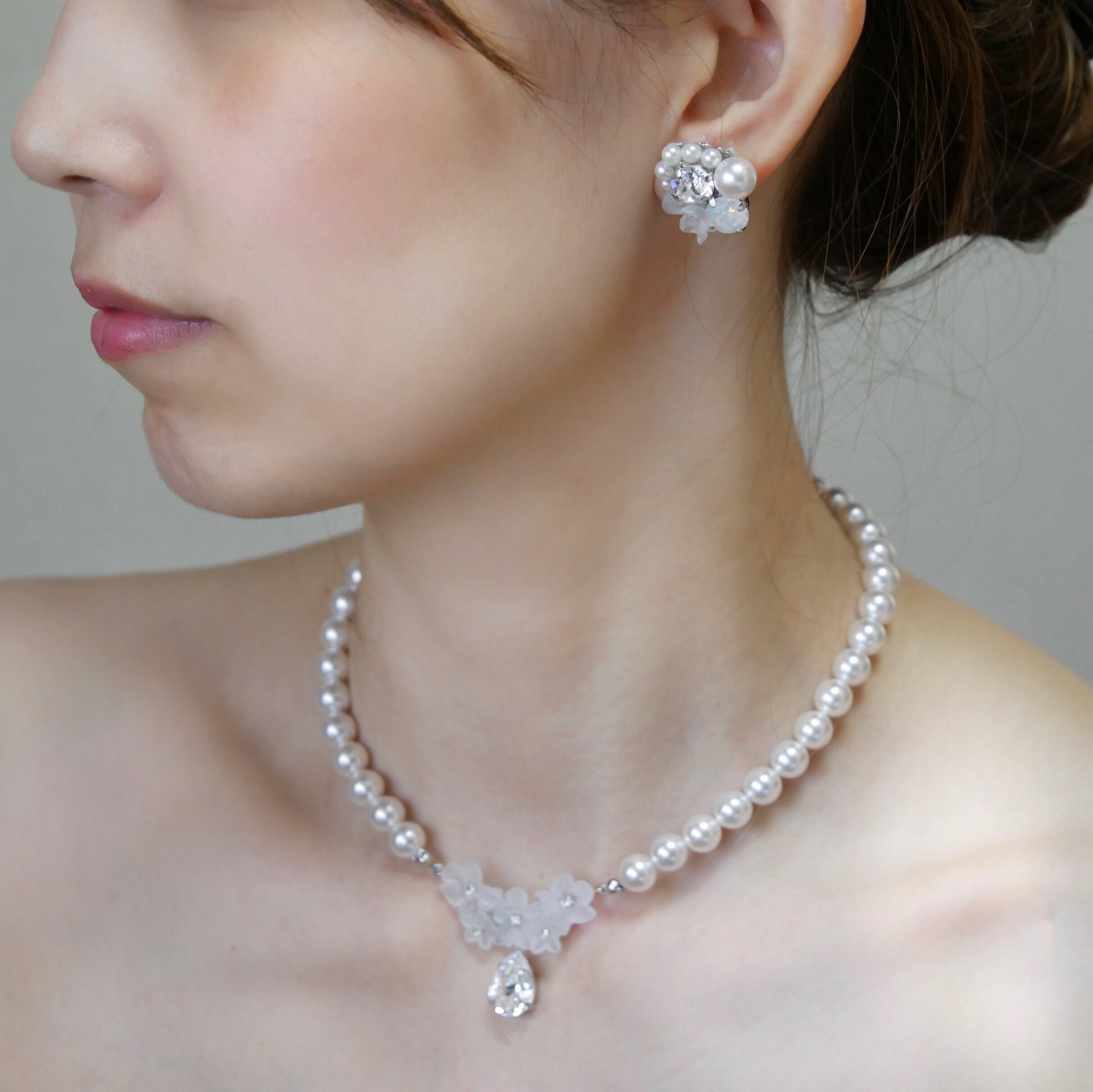 ネックレスのチェーン部分は贅沢に8mmのクリスタルパールで1周させました。ネックレスの留め具はクラスプ、カニカン&アジャスター、マンテルがございます。