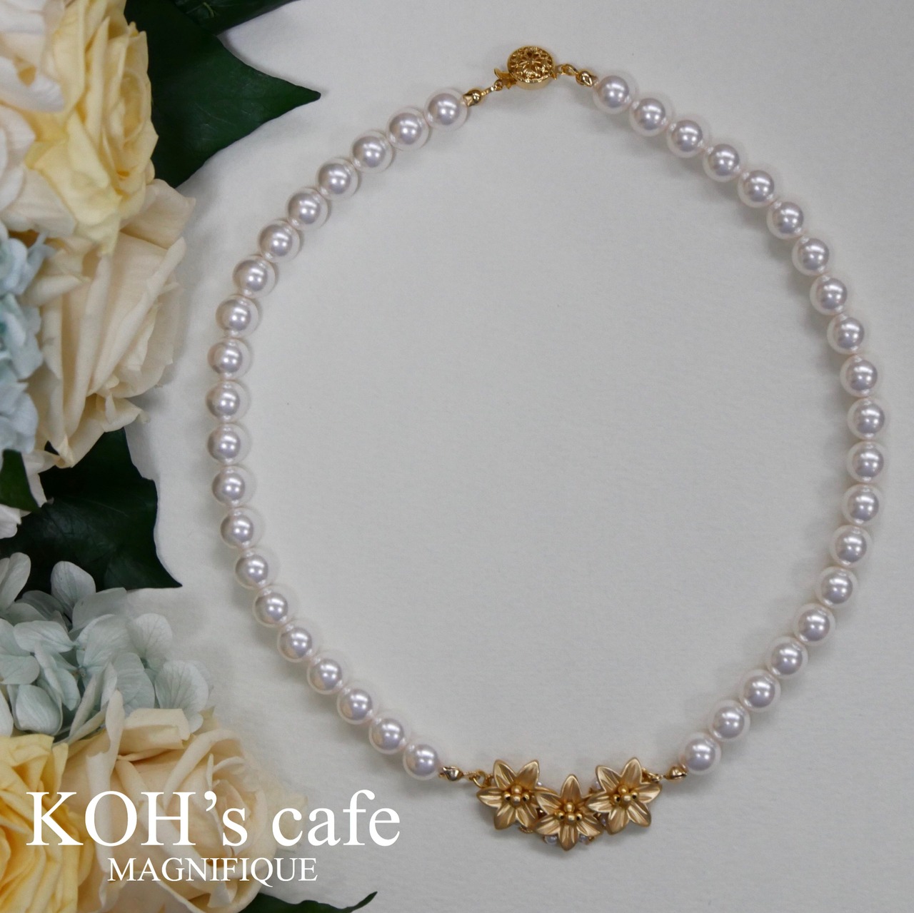 ネックレスのチェーン部分は贅沢に8mmのクリスタルパールで1周させました。