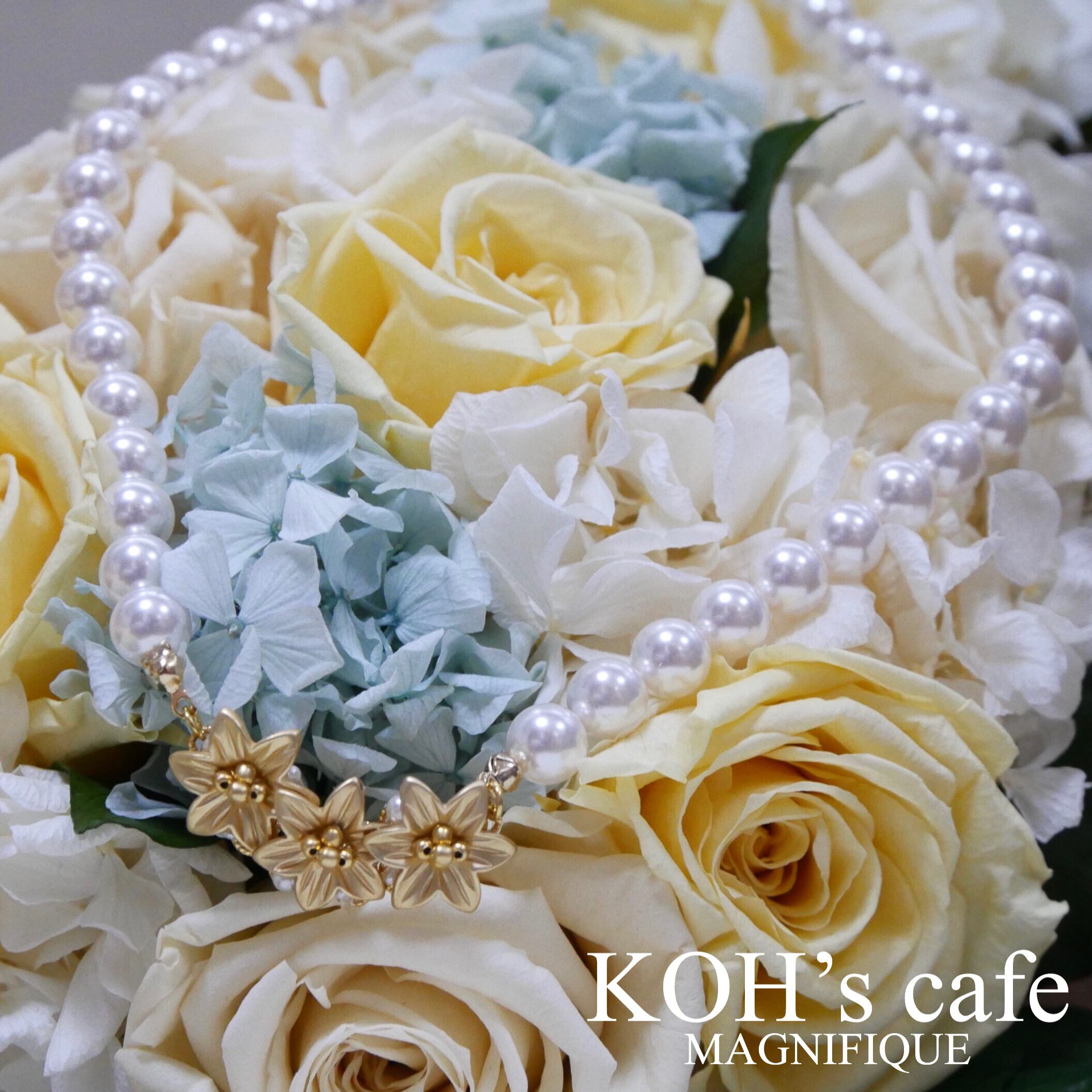 肌馴染みのよいアンティークなゴールドフラワーと艶感のあるクリスタルパールは花嫁様のことをより一層美しく見せてくれるアイテムです。