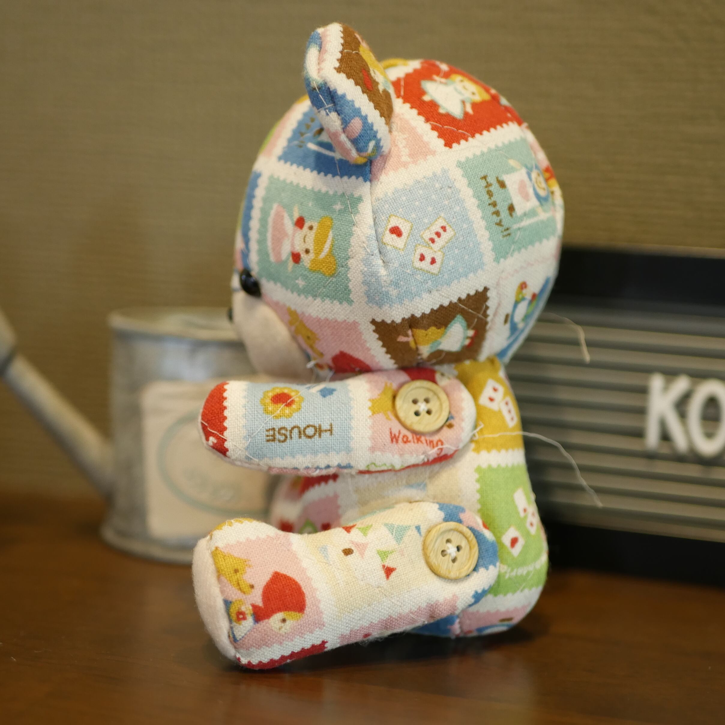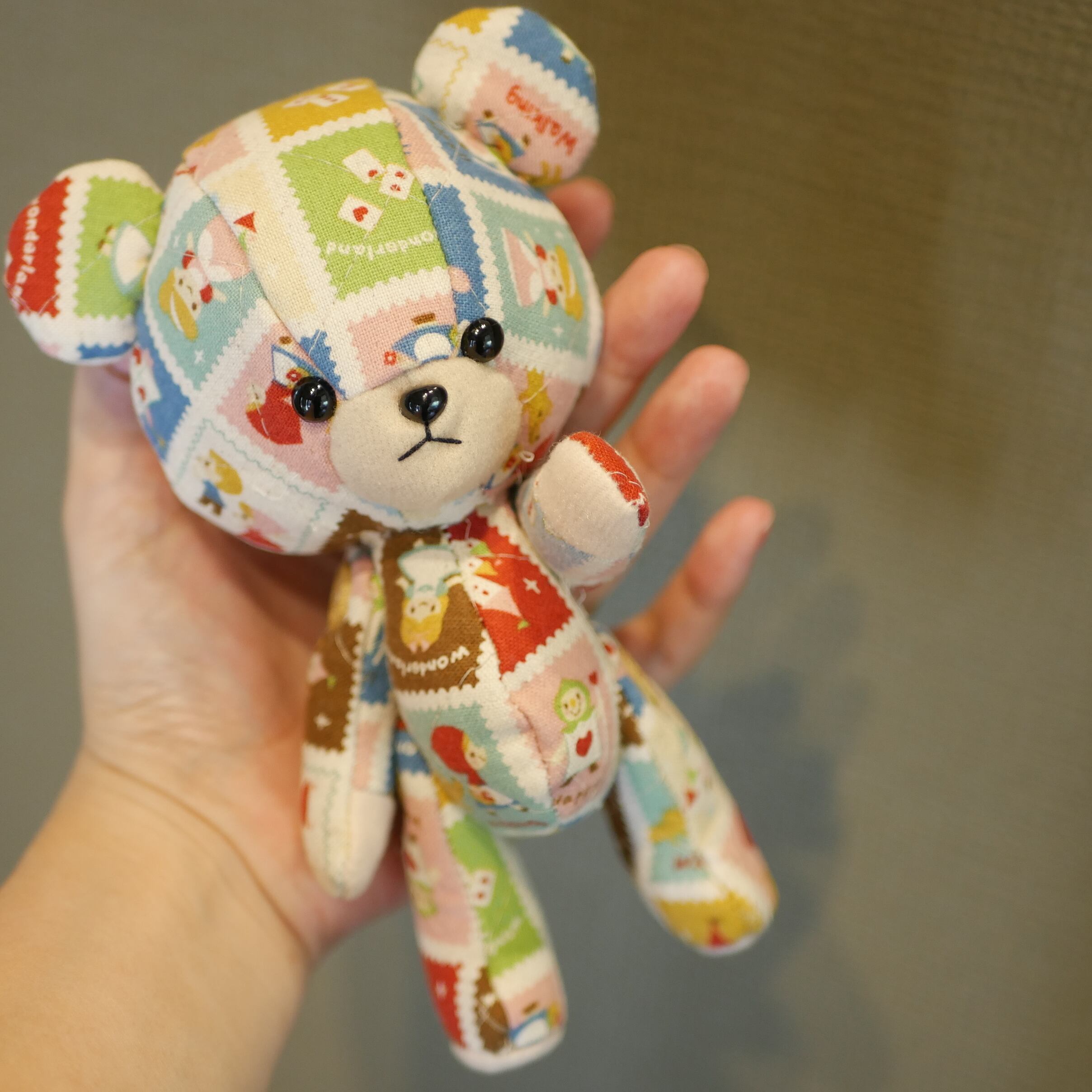 この愛らしいテディベア、「メルヘンちゃん」は、手触りの良いキルト生地で作られています。表面には、たくさんの物語のキャラクターがプリントされているのが特徴。見ているだけで、何度でも楽しめることでしょう。